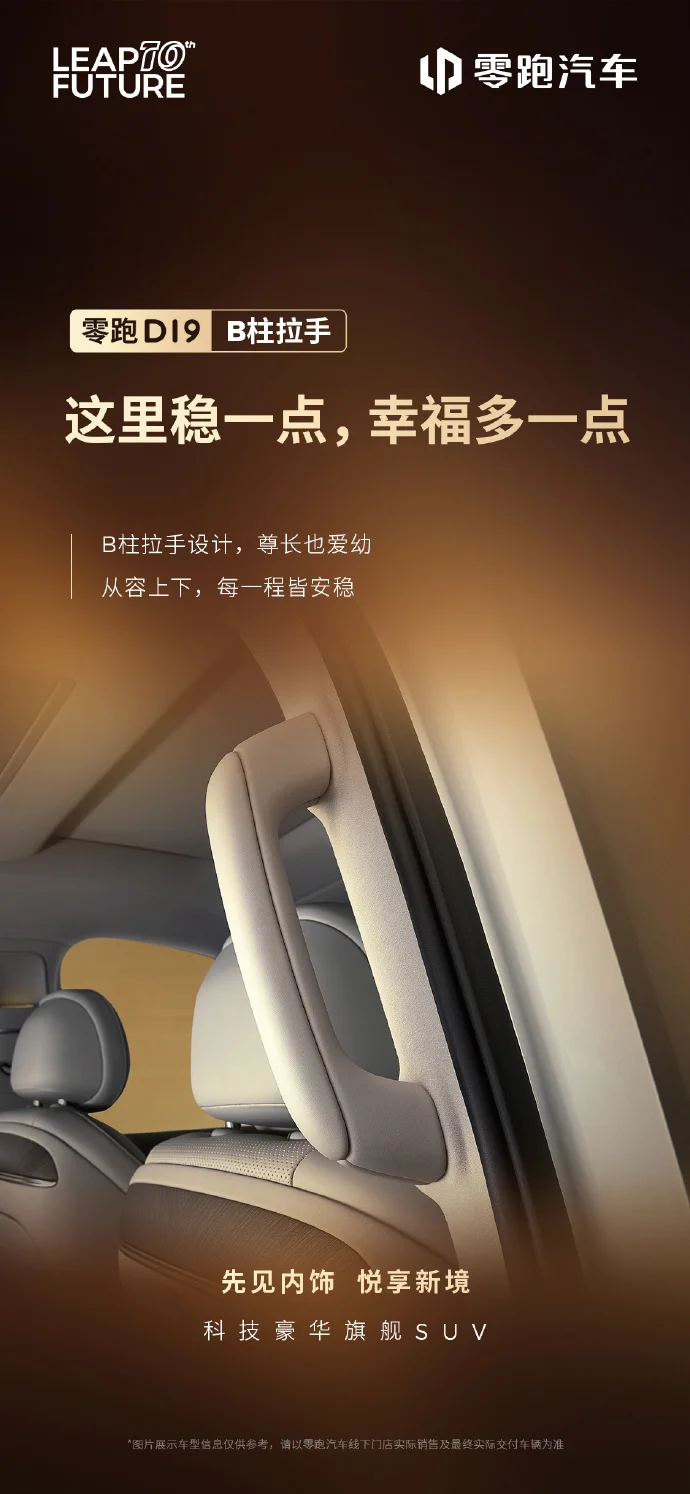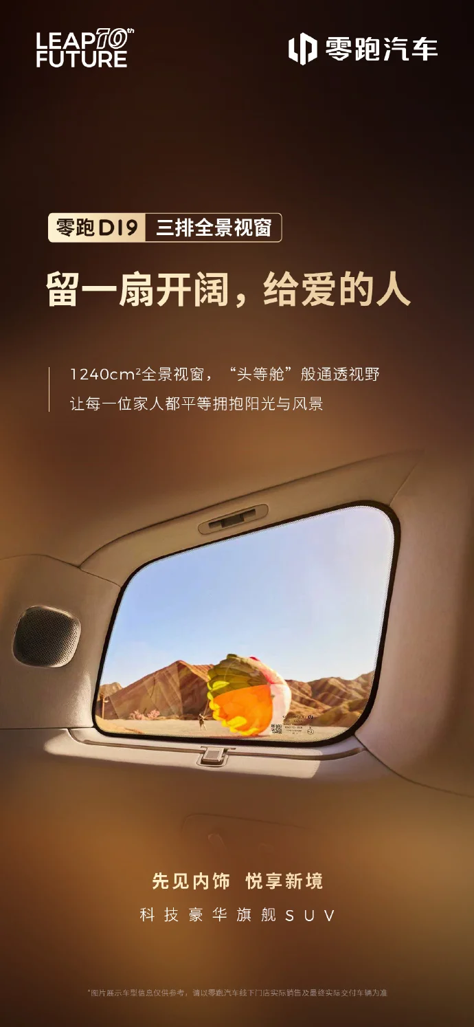 12月23日,零跑汽車繼續公布旗下豪華旗艦SUV D19的部分內飾細節,包括三排全景視窗、三排雙扶手以及B柱貼心拉手。此前公布的內飾細節包括4處柔光壁燈、360度旋轉調節的航空閱讀燈,以及3種濃度可調的智能定制香氛。