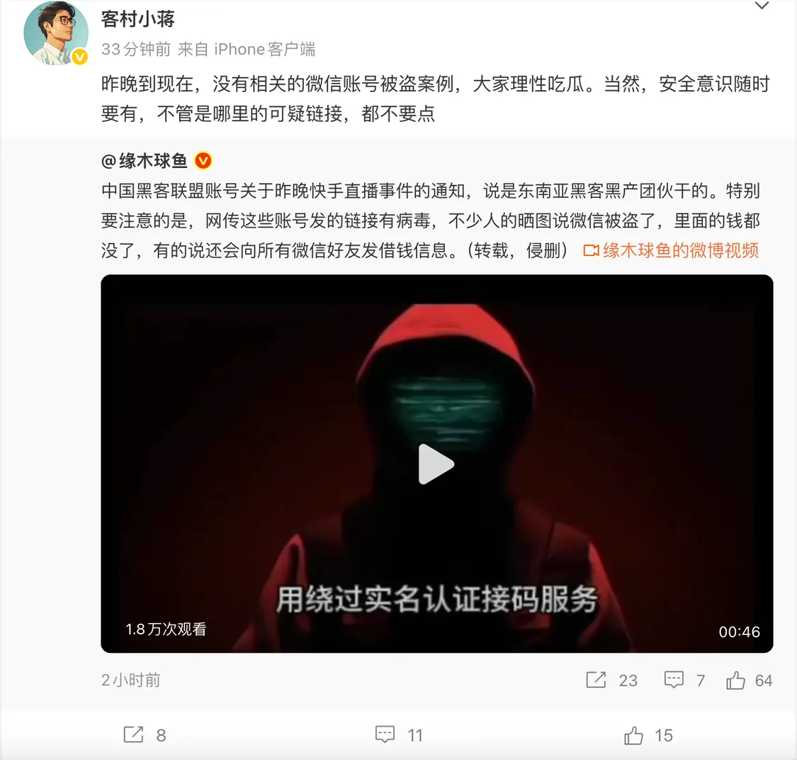 稍早前,微信員工“客村小蔣”也回應稱,“昨晚到現在,沒有相關的微信賬號被盜案例,大家理性吃瓜。當然,安全意識隨時要有,不管是哪里的可疑鏈接,都不要點。”