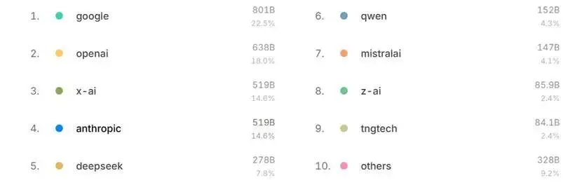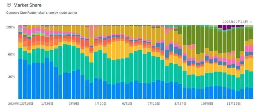 圖:不同大模型廠商的市場(chǎng)份額趨勢(shì),來(lái)源:OpenRouter