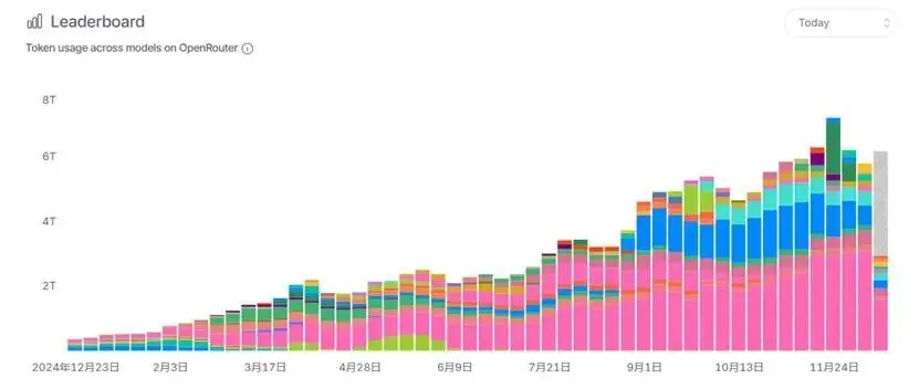 圖:過(guò)去一年不同大模型Tokens調(diào)用量趨勢(shì),來(lái)源:OpenRouter