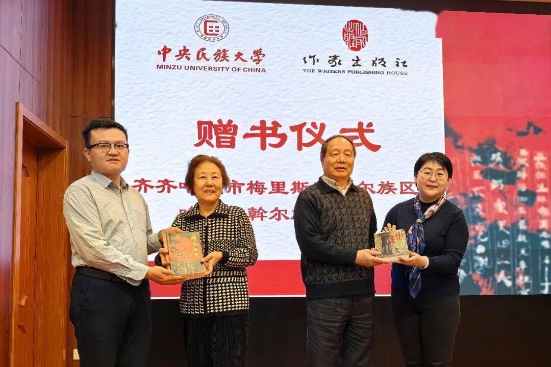 在座談會最后,吳仕民先生和夫人陳虹女士委托中央民族大學文學院,向黑龍江省齊齊哈爾市梅里斯達斡爾族區哈拉達斡爾族小學校簽名贈書。