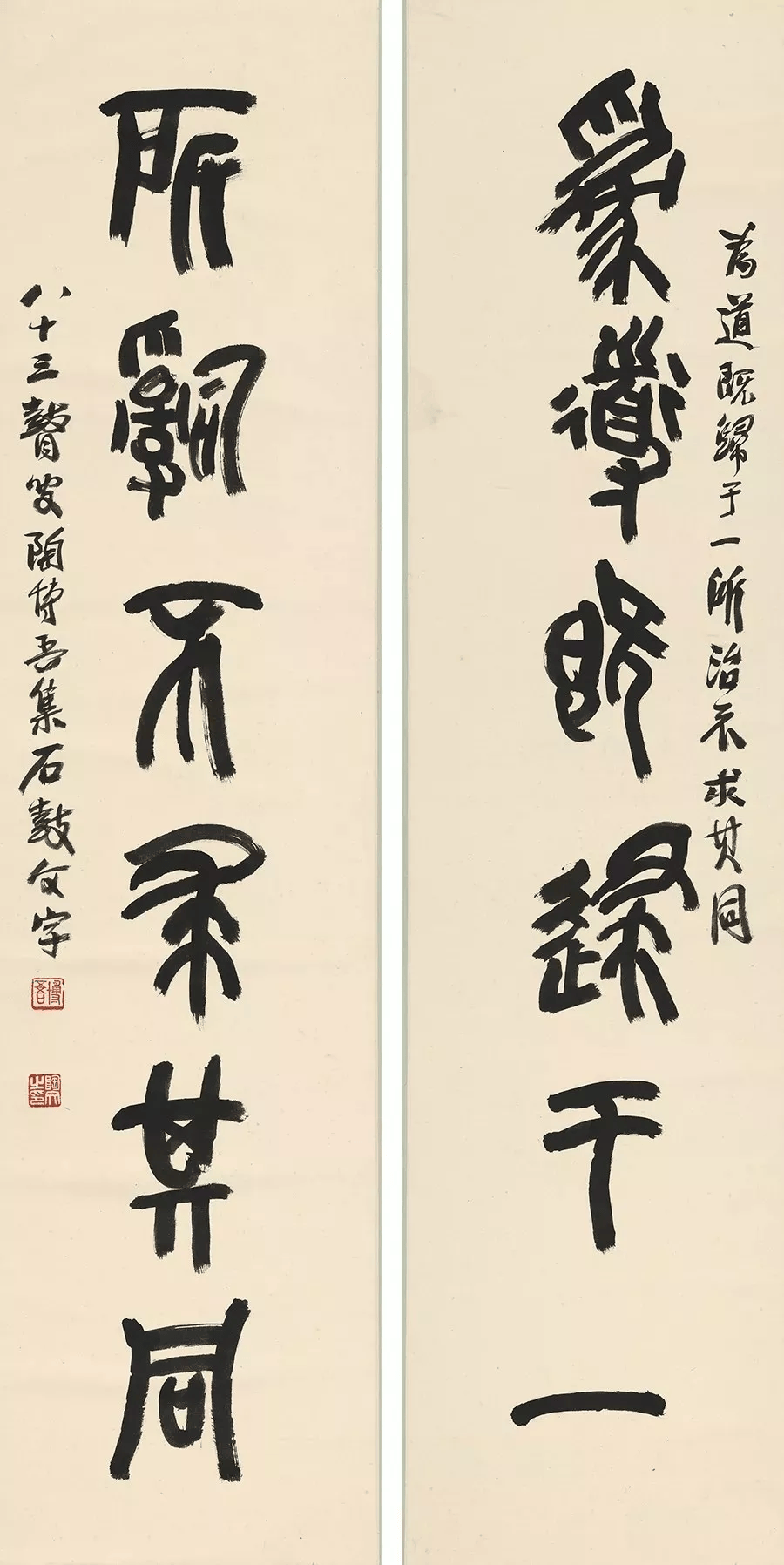 我受吳(吳昌碩)的影響當然很深,愛原刻石鼓,更愛吳所書的石鼓,并從金石索所載的石鼓文字,集成聯語九十六幅。本想跳出吳的藩籬,露點個人風格,然而學識淺薄,兼之書外之音更少,真正是心有余而力不足也。
