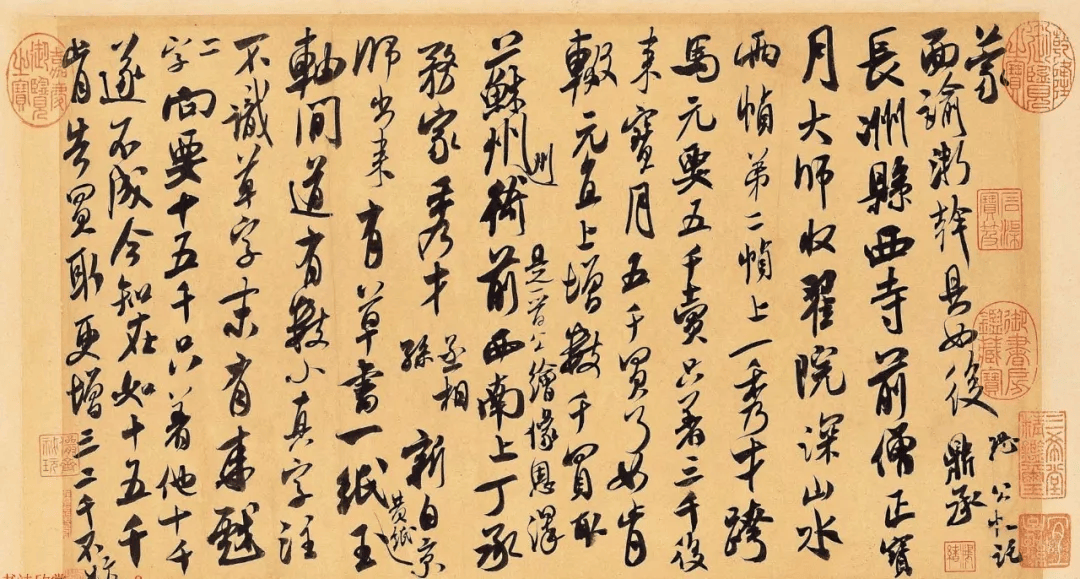 在常態書寫中,對疏與密或者黑與白、實與虛的關注與書寫者的人生境界密切相關。對作品疏與密、黑與白或者實與虛處理得當者在現實生活中往往表現得平等、博愛、自尊程度高、有更高的幸福感。收放自如,則結構(造型)能力就強。在書法上注重收、放者,在現實生活中為人處世也如是,但在一定的時間里受過定向訓練而只是機械地模仿、記憶歷代名家的字跡者除外——往往知其然,而不知其所以然。在收、放這個重要的問題上,在米芾作品中同樣表現出了兩個極端。以上面所列的圖為例,整件作品收放表現極為出色的作品如:(圖一)盛制帖、(圖六)臨沂使君帖——尤其是最后兩行、(圖八)紫金帖;在上列圖中,而收放不夠成功的作品有:(圖二、三)苕溪詩卷、(圖四、五)蜀素帖。簡略闡釋下:在筆畫之間,收放處理得果斷、明晰極有創造力,而在偏旁之間的處理卻表現平庸,甚至可以說是糟糕,具體表現在:如,左右、左中右結構的字,左右、左中右之間幾乎沒有空間,甚至相互抵觸。可以看出米芾內心是相當壓抑的,在很多情況下,不大給別人留有余地,不給別人留有余地,自己也就沒有余地,壓抑與痛苦就是隨之而來的了,這也可以給他的仕途經歷作注解。寫到這里,有的朋友會說了,你剛才談到他線條溫潤的時候,不是說米芾富有溫情、愛心的么?這兒他怎么又不給別人余地了呢?本人的理解是,其內心的痛苦與掙扎有時讓他很難控制自己理想的自我的表現。